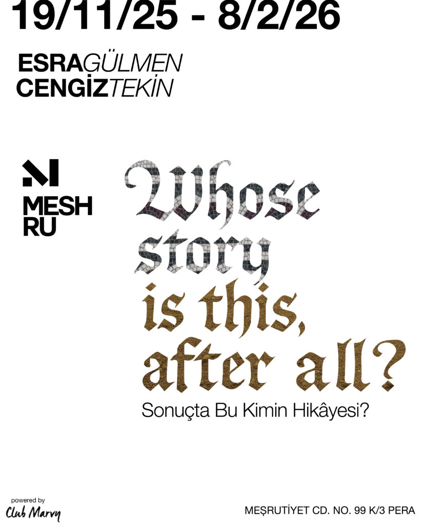 Esra Gülmen ve Cengiz Tekin’in “Sonuçta Bu Kimin Hikâyesi” isimli sergisi 8 Şubat 2026 tarihine kadar MeshRu’da ziyaret edilebilir.